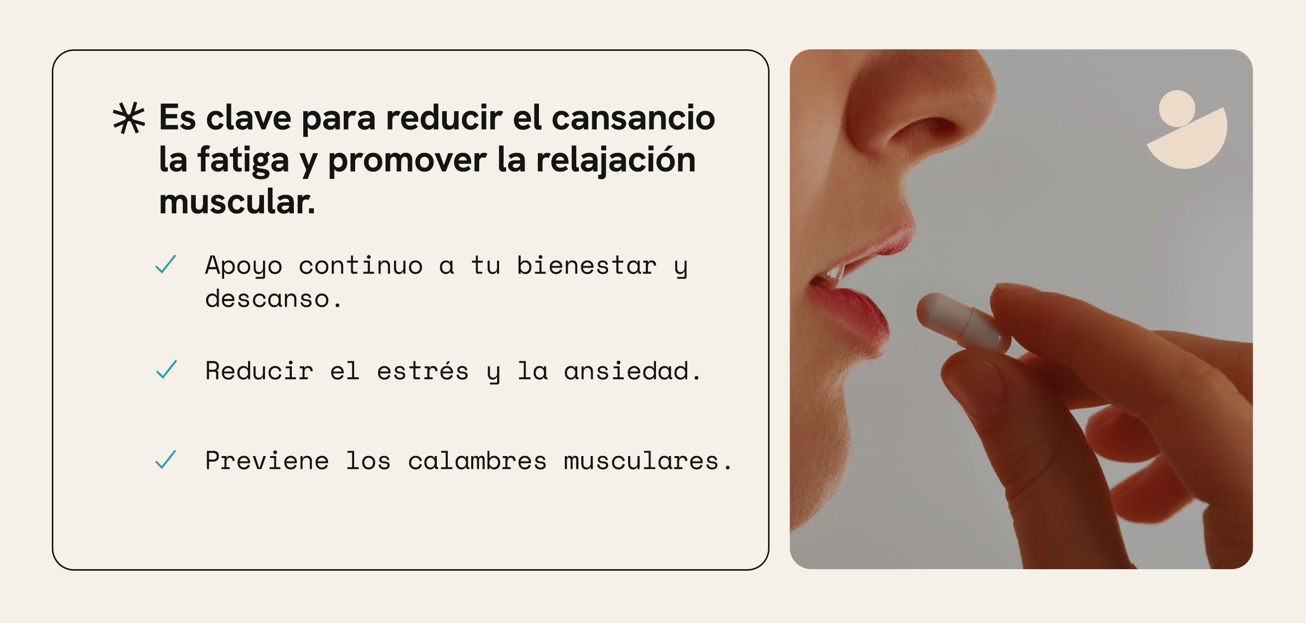 Sí, es una de las mejores opciones para estos casos. Al tener una alta biodisponibilidad, el magnesio llega eficazmente a los tejidos para facilitar la relajación muscular (ayudando a prevenir calambres, incluso nocturnos) y calmar el sistema nervioso, promoviendo un descanso más profundo.